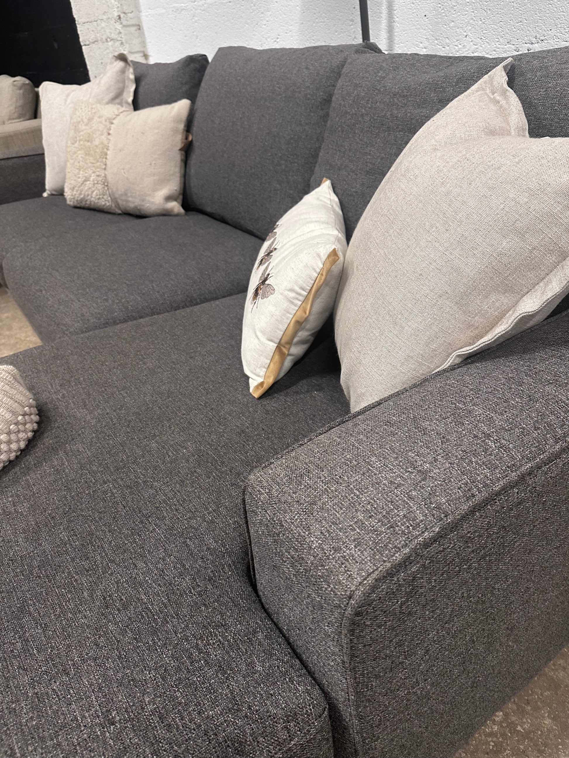 Wrapped in a soft tweedy mushroom material and sat upon dark would feet, this comfort pleaser is the perfect place for relaxing. Because of its earthy tones it looks great with subtle hues or bright pops of colour. The sofa comes in two parts for ease of getting it into your home