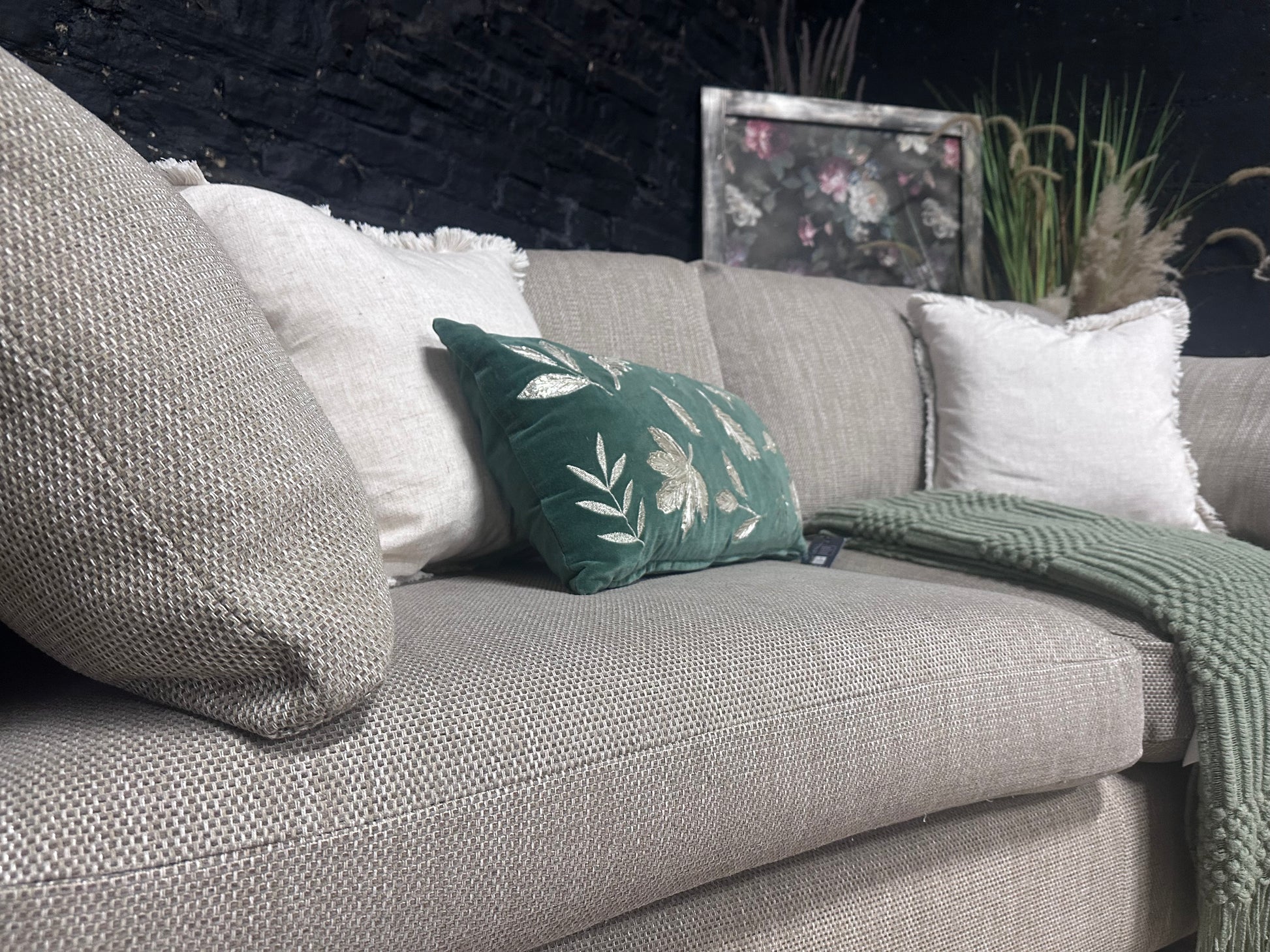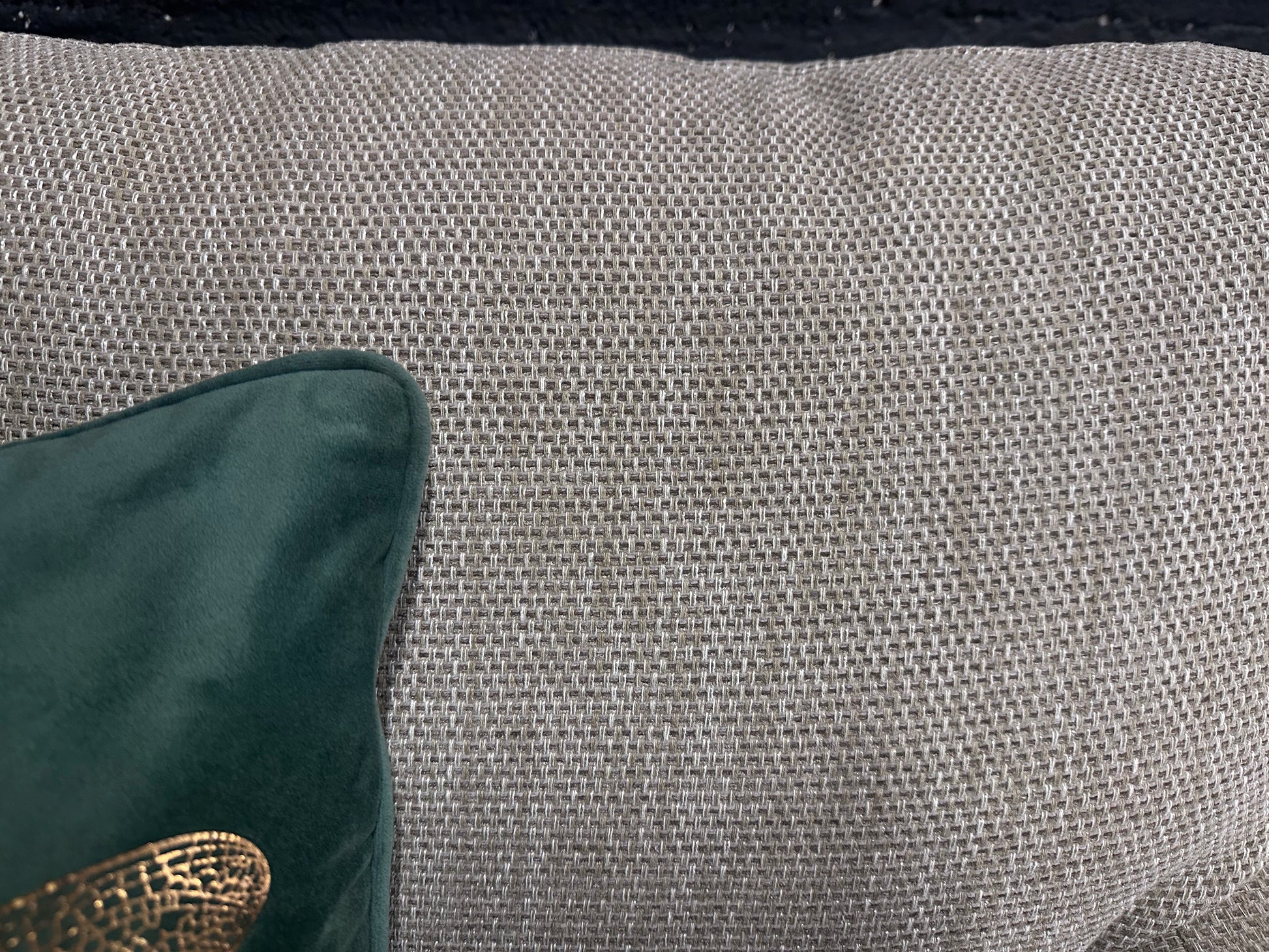 Here we have a gorgeous set from next with deep squidgy comfort seats and wrapped in a warm neutral woven mixed fabric. The sofa has removable bolster feather filled cushions for extra comfort and sat upon dark wood legs